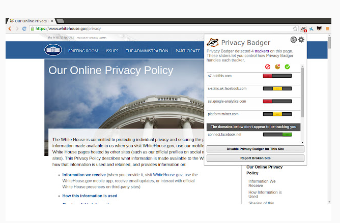 Privacy Badger is a browser extension that stops advertisers and other third-party trackers from secretly tracking where you go and what pages you look at on the web. If an advertiser seems to be tracking you across multiple websites without your permission, Privacy Badger automatically blocks that advertiser from loading any more content in your browser. To the advertiser, it’s like you suddenly disappeared. Privacy Badger was born out of our desire to be able to recommend a single extension that would automatically analyze and block any tracker or ad that violated the principle of user consent; which could function well without any settings, knowledge, or configuration by the user; which is produced by an organization that is unambiguously working for its users rather than for advertisers; and which uses algorithmic methods to decide what is and isn’t tracking.
