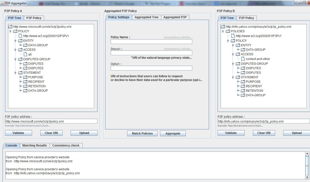 The need for aggregating privacy policies is present in a variety of application areas today. In cloud computing paradigm, the ability to aggregate policies as well as services will be useful and more effective for users that are privacy conscious regarding their sensitive or personal information. This project studies the problems associated with the Platform for Privacy Preference (P3P) language, and the present issues with communicating and understanding the P3P language. Furthermore, it discusses some efficient strategies and algorithms for the matching and the merging processes, and then elaborates on some privacy policy conflicts that may occur after merging policies. Lastly, the project presents a tool for matching and merging P3P policies. If successful, the merge produces an aggregate policy that is consistent with the policies of all participating service providers.