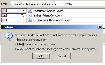 This Thunderbird extension displays a warning if you send a message from your private emailID to an address which is not found in your Personal Address Book. *Current Developer: Fabrizio fbpublic@gmail.com*