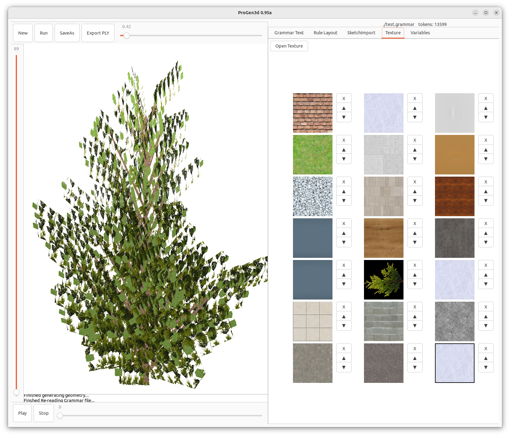 The software program shown on the right is a 3D building procedural generation tool named ProGen3D. This kind of software is used to create three-dimensional architectural models using algorithms and rules defined by the user. The user can specify various parameters and constraints which the software then uses to generate complex structures. One of the key features of such programs is the ability to export the created models in various file formats, which appears to include the PLY format in this case.