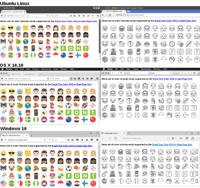 A color and B&W emoji SVGinOT font built from EmojiOne artwork with support for ZWJ, skin tone diversity and country flags. The font works in all operating systems, but will currently only show color emoji in Firefox, Thunderbird, Photoshop CC 2017, and Windows Edge V38.14393+. This is not a limitation of the font, but of the operating systems and applications. Regular B&W outline emoji are included for backward/fallback compatibility. SVG in Open Type is a standard by Adobe and Mozilla for color OpenType and Open Font Format fonts. It allows font creators to embed complete SVG files within a font enabling full color and even animations. There are more details in the SVGinOT proposal and the OpenType SVG table specifications. The default serif, sans-serif and monospace font for most Linux distributions is DejaVu. DejaVu includes a wide range of symbols that override the EmojiOne Color characters.