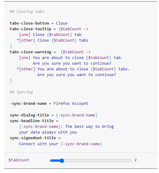 Fluent is a localization system designed to unleash the expressive power of the natural language. This repository contains the specification, the reference implementation of the parser and the documentation for Fluent. FTL is the syntax for describing translation resources in Project Fluent. FTL stands for Fluent Translation List. The syntax/ directory contains the reference implementation of the syntax as a LL(infinity) parser. The spec/ directory contains the formal EBNF grammar, autogenerated from the reference implementation. Software localization has been dominated by an outdated paradigm: translations that map one-to-one to the English copy. The grammar of the source language imposes limits on the expressiveness of the translation. We created Fluent to change this paradigm. Translators should be able to use the entire expressive power of their language without asking developers for permission. In Fluent, translations are asymmetric.