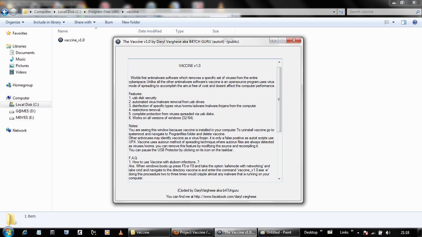 Worlds first antimalware software which removes a specific set of viruses from the entire cyberspace.Unlike all the other antimalware software's vaccine is an opensource program,uses virus mode of spreading to accomplish the aim,is free of cost and doesnt affect the computer performance.