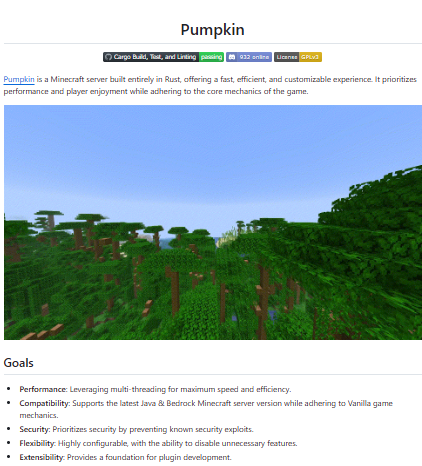 Pumpkin is an open-source Minecraft server implementation written entirely in the Rust programming language with the goal of delivering high performance, efficiency, and modern architecture for hosting multiplayer worlds. Unlike the original Java-based server, Pumpkin focuses on leveraging Rust’s memory safety and performance advantages to create a fast and stable server environment. The project aims to replicate the core mechanics and gameplay of Minecraft while providing a flexible foundation for customization and optimization. Its architecture emphasizes efficient networking, resource management, and scalability, allowing servers to handle more players with reduced system overhead. Pumpkin is designed to be approachable for developers and server administrators who want to run Minecraft servers with improved performance and modern tooling.