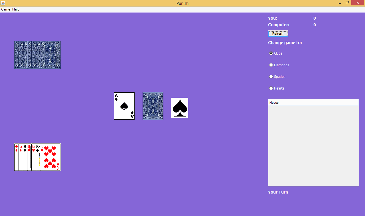 Play against the computer in this exciting game. Each player gets dealt 7 cards, and they take turns to get rid of the cards in their hands as quickly as possible. The first player to do so is the winner. While discarding cards, the player must match the suit or the number of the card currently at the top of the discard pile. Alternately, the player can play a Jack of any color to change the suit to one he desires. If an Ace is played, it must be followed by another card matching the suit of the Ace or another ace, failing which he must draw a card, but not if the Ace was the last card in his hand. Playing an Eight results in all other players drawing one card from the draw pile. If the player does not have a suitable card to play, nor an Ace/Jack/Eight, he must draw a card.