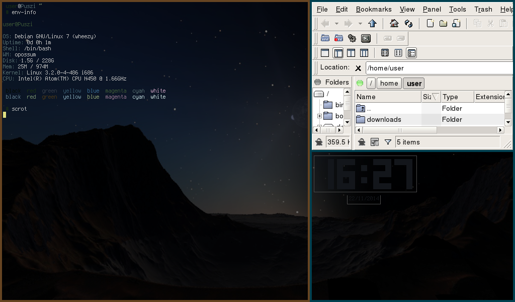- P.C. with 1G ram installed-tty and DVTM <40mb,Xorg with DWM, Opossum and i3 <50mb.