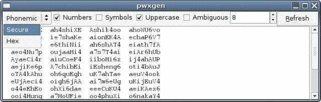 pwxgen is a wxWidgets/C++ program which tries to mimic the behavior of the excellent pwgen tool, by Theodore Ts'o, in a GUI.