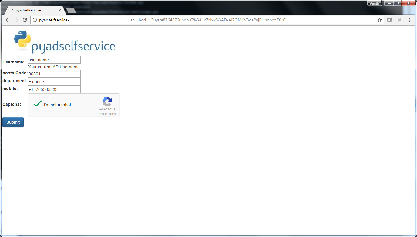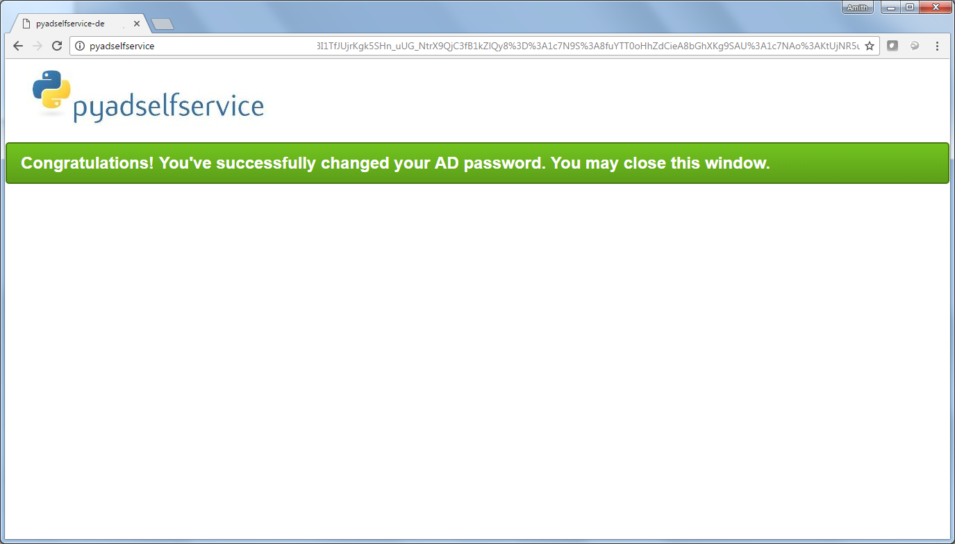 pyadselfservice is a software created using Python 3.5 and Django 1.10. This project aims to provide web based password change interface to the end users, for their Active Directory account. While changing the password, users won't not need to enter their current password. Which means users can change their password even if they have forgotten their current password. Moreover, while changing the password, this software will automatically unlock the user account if it is locked.