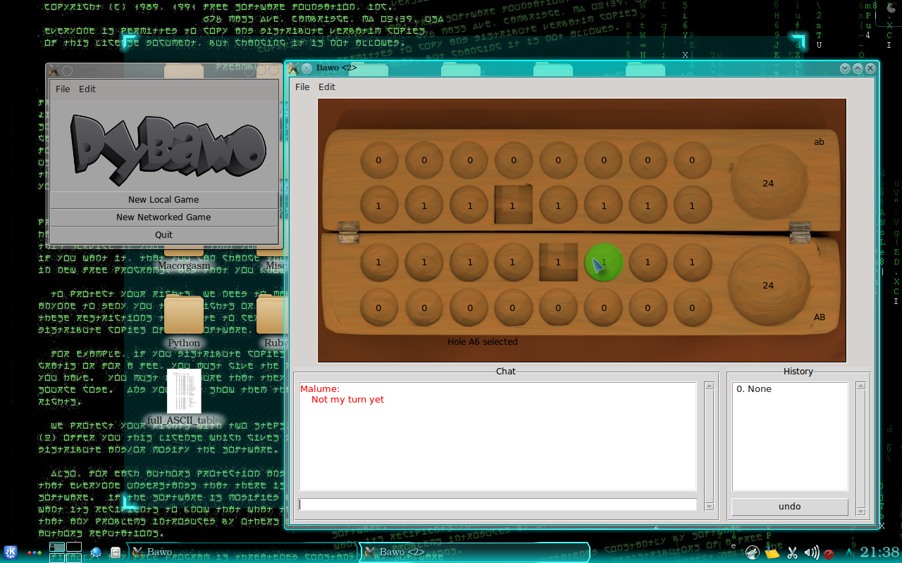 PyBawo is a multiplayer implementation of the East African board game, Bao (Bawo) in Python. PyBawo largely implements Bao (Bawo) as played in Malawi with additional rules that eliminate the possibility of infinite moves. PyBawo currently supports local two player games against another human or the computer.