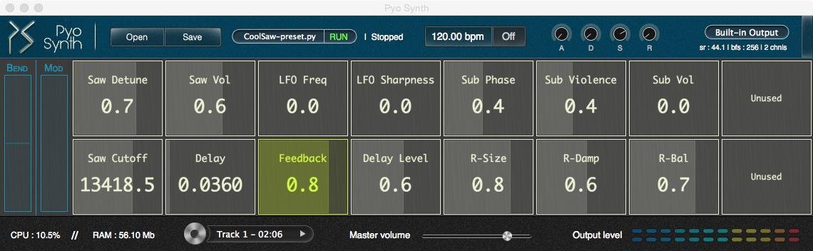 Pyo Synth is an open source application that makes the manipulation of pyo scripts easier by letting you control it with a midi keyboard. The interface allows you to setup every control on your keyboard and link them to parameters in your script during runtime. It is also possible to save your progress directly in the pyo script. See manual for more explanation on features.