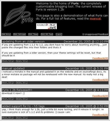 Pyris is a completely customizable blogging tool with RSS, a photo album, and much more! It is written in PHP and generates valid XHTML 1.0 Strict pages. It also archives old entries to XML files by month.