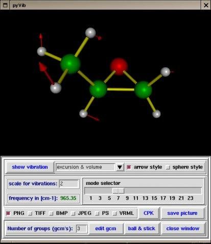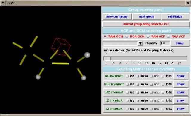 pyVib is a Python-based molecular graphics visualizer. It allows visualizing vibrational modes (from latest gaussian fchk files), the related IR/VCD/Raman/ROA spectra, the GCM's (group coupling matrices) and ACP's (atomic contribution patterns).