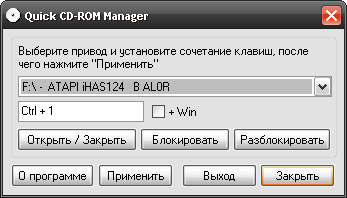 Small utility to control CD/DVD/BD-ROM tray. Able to open, close, lock and unlock tray of any mounted removable device using customizable hotkeys or GUI.