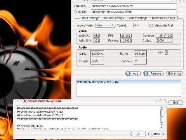 QCreateVOB is a easy vob creator using transcode, mjpegtools, ffmpeg, sox, multimus and mplayer. It is based on Qt 3.3