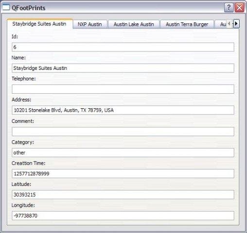Footprints is an App provided by HTC Android based phones, combining the GPS position, a photo, address and other tags of a location into a database . QFootPrints, a portable, QT-based application, supports importing, editing and exporting them.