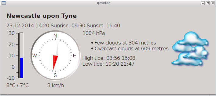 QMetar is based on kweather which was part of KDE3 but unfortunately longer of KDE4. It was ported to Qt to make it multi-platform and extended to show tidal information. It is written in C++ using the Qt toolkit.
