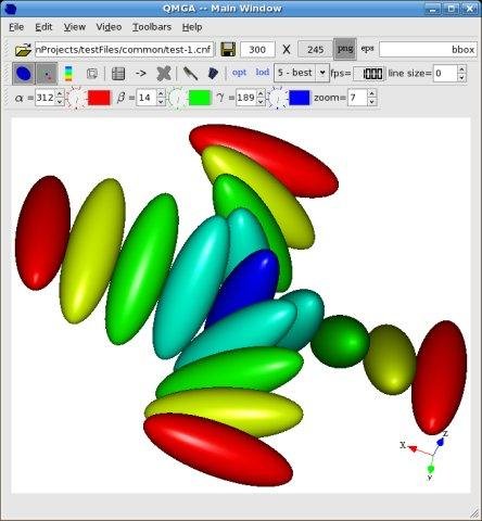 QMGA is a Qt-based molecular graphics application for visualizing large ensembles of ellipsoids, spherocylinders or spheres. It is conceived for coarse-grained mesoscopic molecular simulation, but can be used for any kind of convex body systems.