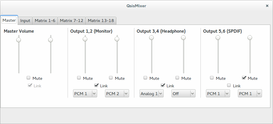 Qsismixer is a frontend gui to control the alsa mixer for Focusrite's Scarlett 6i6 USB sound card on Linux. It builds against the Qt5 framework and the Linux kernel's ALSA API.