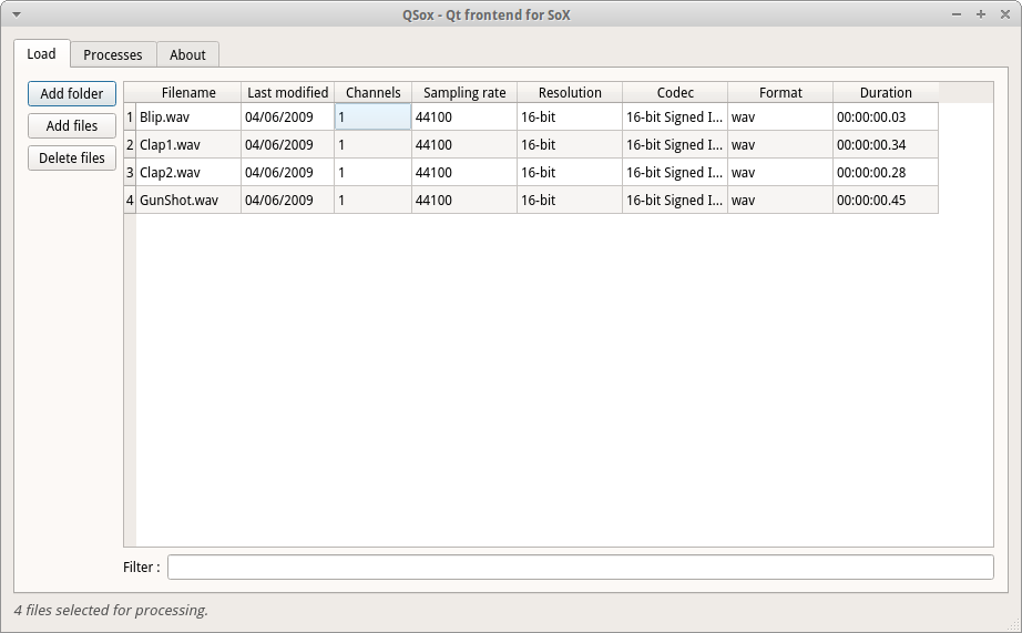 A batch-oriented frontend for SoX with Qt. For Mac OS X, download source code, Qt-creator and SoX. We will release a version as soon as possible.