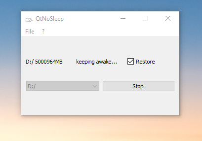 QtNoSleep is a lightweight graphical utility program written in C++ and Qt to keep awake your HDD by periodically writing a 1MB file to root of the disk. Currently it works on Windows only.