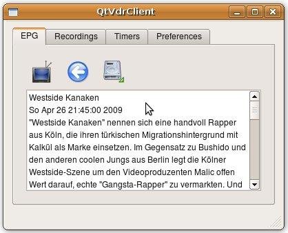 QtVdrClient shows the EPG (electronic program guide) data from a Linux-VDR system. By browsing the data, items can be choosen for recording.