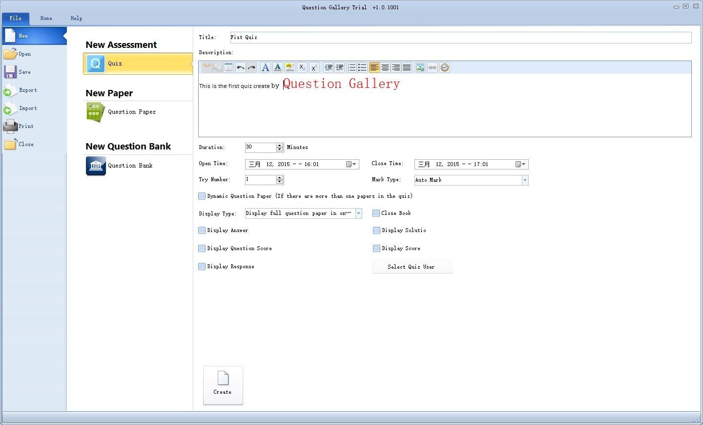 Question gallery is a tool which can help teachers to create/manage quiz/question pages/question banks. It create Multi-choice Multi-response Fill-in-blank Match Essay and Composite questions with rich contents. The quiz can be export in html format. The quiz also can be printed on a paper.