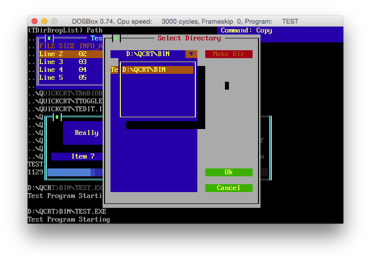 Based upon my 20+ year old super fast QCrt text mode display driver, QuickCrt is an event driven object-oriented framework for rapid application development using Turbo Pascal 7.0 for DOS. Completely self contained, it uses no 3rd party or original Borland units (excluding the built-in System unit). It uses no Turbo Vision and is more like Delphi minus the drag and drop. It has support for String formatting, Custom text fonts, Themes, Keyboard mappings, Config files and Multiple languages baked into it. However, this initial version is more of a "Proof of Concept" and engine for PGME. Rather than an actual project. It has some serious limitations. Since it was built in a "vacuum" with no pre-planning, it is a little bit of spaghetti code. Also, it doesn't support real windowing, multi-tasking or draw behind visible objects.