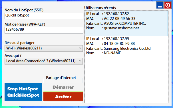 - Get connected users informations (local ip , name , network card manufacturer and MAC adresse)