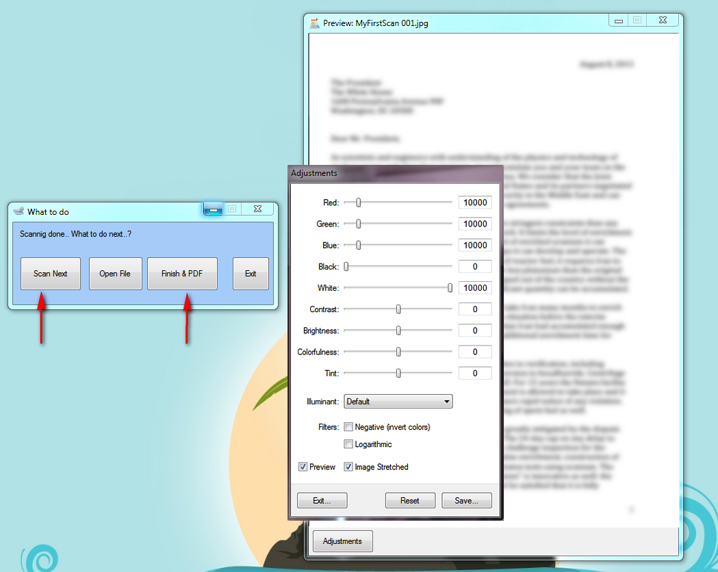 - Post scan box (Open the last scanned file in the default picture viewer / windows explorer / export all to PDF)