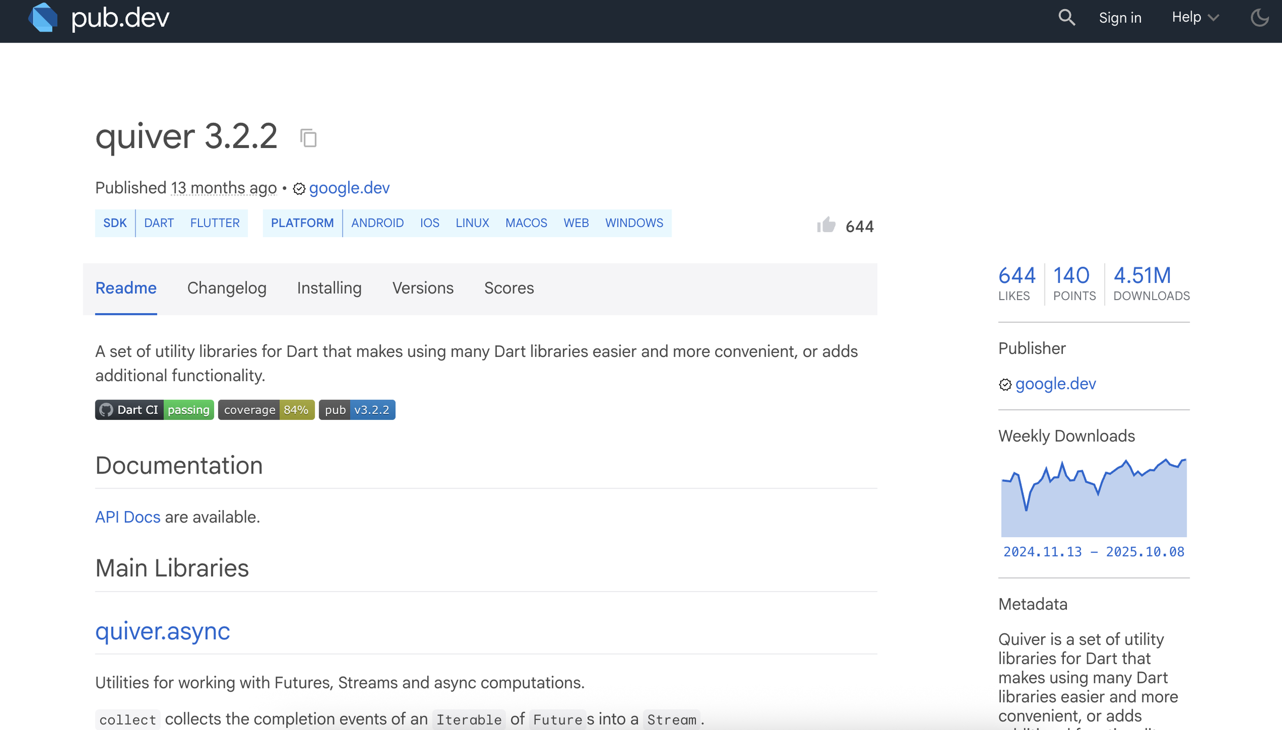 Quiver is a comprehensive collection of utility libraries for Dart that extends core functionality and simplifies common programming patterns. It provides reusable tools for asynchronous programming, data structures, caching, time manipulation, string utilities, and more. Originally inspired by Google’s internal libraries, Quiver helps developers write cleaner, more expressive, and testable Dart code. Its modular design allows importing only the needed packages, making it both flexible and lightweight. Quiver also includes testing utilities that make it easier to simulate asynchronous behavior, time, and equality checks in unit tests.