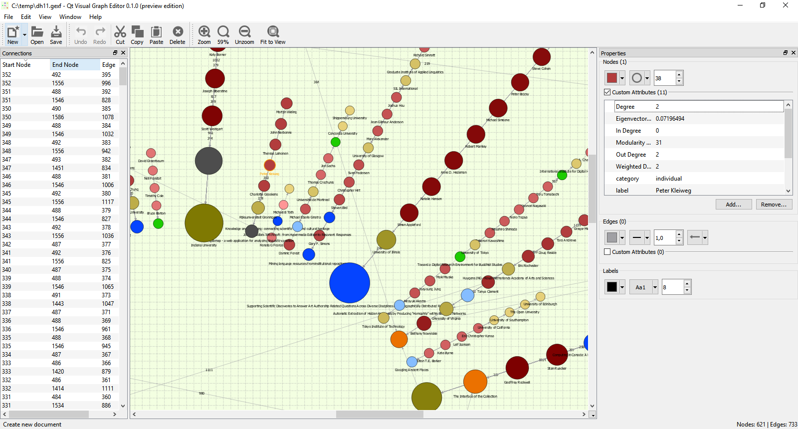 Please note that qvge is not a replacement for such a software like Gephi, Graphvis, Dot, yEd, Dia and so on. It is neither a tool for "big data analysis" nor a math application. It is really just a simple graph editor :)