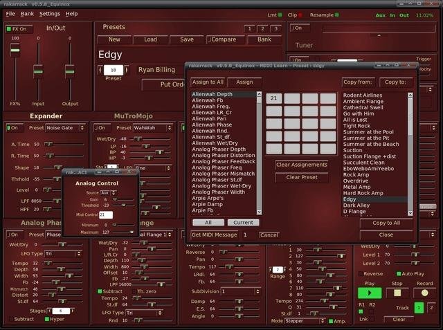 Rakarrack is a stereo digital effects processor for Linux with jack support. Standard line-up of nearly 40 effects modules include Equalizers, Reverbs, Echo, Flange, Chorus, Distortions, WahWah, Vocoder, and other filters and processing modules.