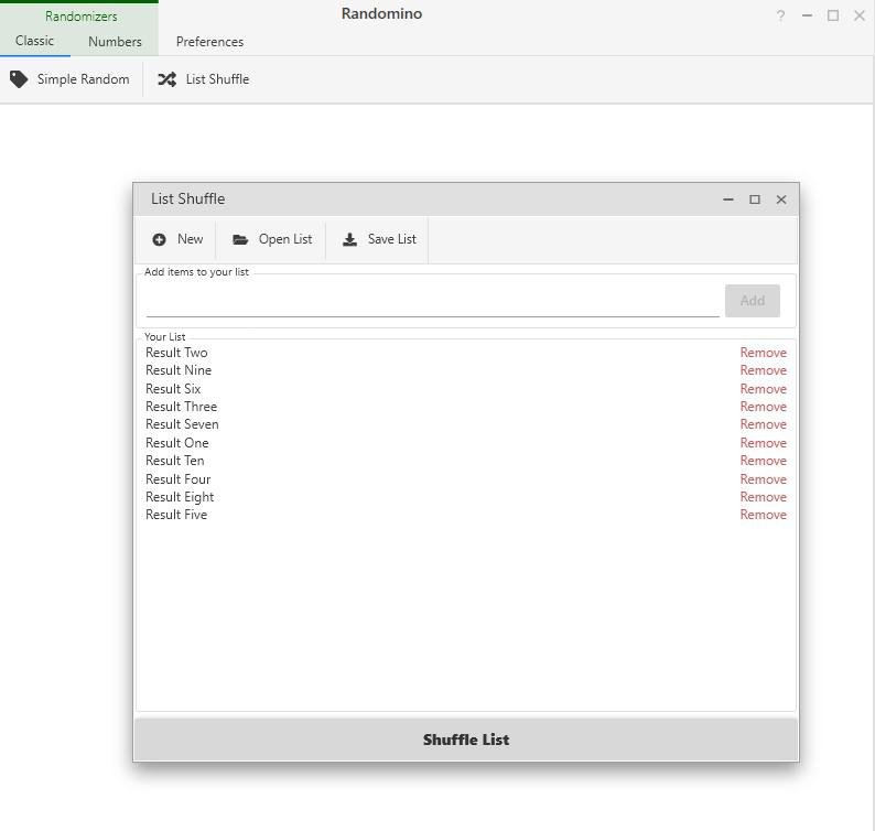 Simple randomizer with ability to save lists of items for later reuse and automatic clipboard copy of result.