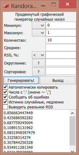 Randorator is an advanced graphical generator of random numbers. The program creates the specified number of values in a certain interval. Optionally, the average value of the received number, the maximum relative standard deviation and number of digits for rounding is able to specify. There are possibilities to select decimal mark and to automatically copy in the clipboard.