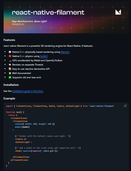 react-native-filament is a React Native wrapper for Google's Filament real-time physically-based rendering engine, enabling mobile developers to render high-quality 3D scenes within React Native applications. This library acts as a bridge between JavaScript and the powerful Filament engine through native modules, giving React Native apps access to modern rendering capabilities like PBR materials, image-based lighting, and dynamic shadows. Designed for both iOS and Android, it opens the door to immersive and visually stunning experiences directly within mobile apps using familiar React Native components.
