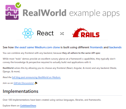 RealWorld is the “mother of all demo apps”—a full spec and starter backend/frontend that implements a Medium-like blogging platform to showcase best practices across many frameworks. Instead of trivial todo lists, it provides a realistic feature set: authentication, CRUD operations, pagination, comments, profiles, tagging, and favoriting. The same spec is realized dozens of times (React, Vue, Svelte, Angular, Solid, Next, Remix, and many more), alongside multiple server implementations, so learners can compare idioms without guessing about feature gaps. A shared API contract and test suite keep implementations consistent and reveal framework-specific tradeoffs clearly. This makes the repo a powerful teaching tool for architecture, state management, testing, and deployment patterns at production scale. Teams also use it to evaluate new frameworks by building “yet another RealWorld” and measuring DX, bundle size, and maintainability.