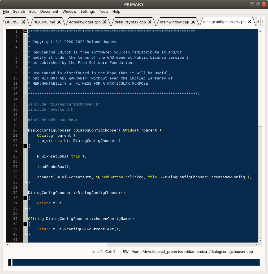 This began as a fork of the Diamond text editor. It now shares very little DNA with Diamond because it uses CsScintilla edit widgets and has many more features. EDT keypad navigation, themes, configurable backup history, along with many other improvements have happened. Project still uses CopperSpice cross platform library.