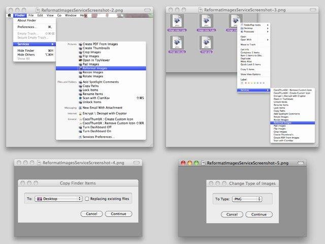 This service will be available in Finder's Services menu and contextual menu if image files are selected. Enables to batch convert images. Supported formats: BMP,GIF,JPEG,JPEG 2000,PDF,PICT,PNG,TIFF. Location for resulting images must be different.