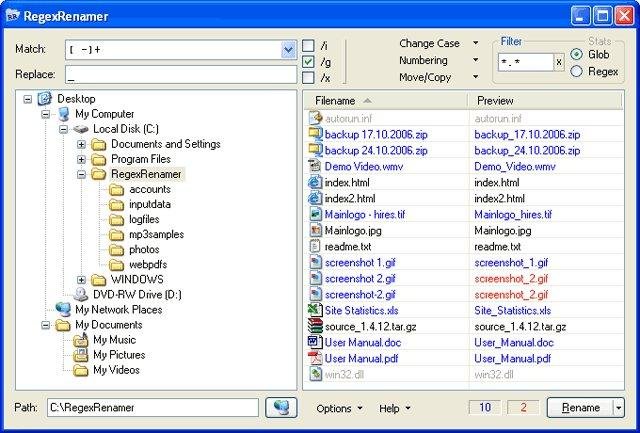 RegexRenamer is a powerful user-friendly graphical tool used to batch rename files using regular expressions. Features realtime preview, filtering, case-changing, numbering, expression validation, network support, folder renaming, help w/ regex tutor