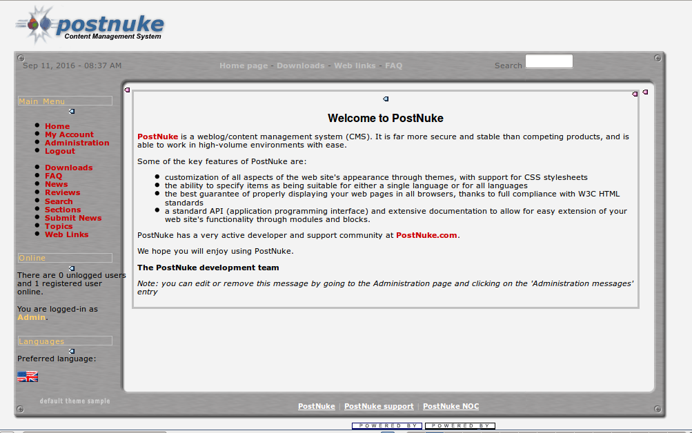 PostNuke started officially in the summer of 2001. After several years of development the PostNuke came to an official end in 2008. A decision was made to provide security updates for PostNuke until 1st July 2009 and there will be no more releases of PostNuke beyond version 0.764.