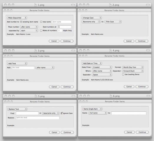 This service will be available in Finder's Services menu and contextual menu if files and/or folders are selected. Batch rename them in various ways. Actions: Make Sequential, Add Text, Replace Text, Change Case, Add Date or Time, Name Single Item.