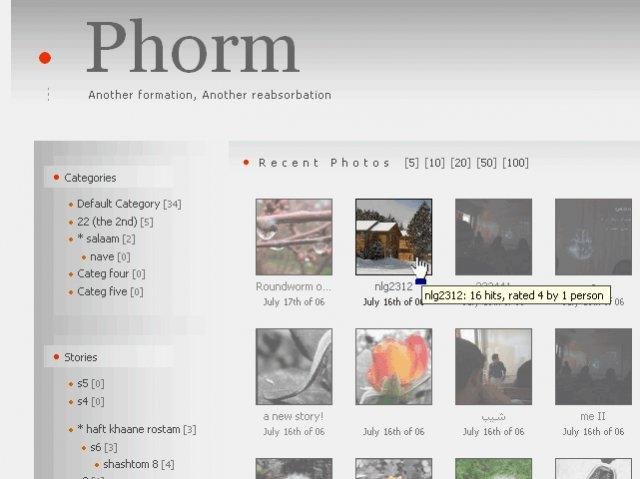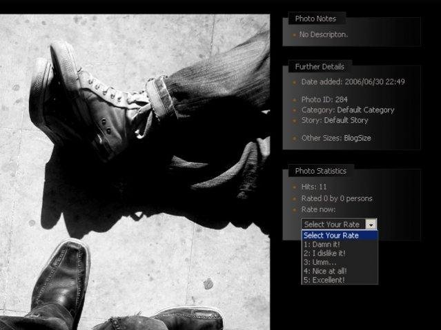 Phormer is a Light & Powerful Photo Gallery / Album in PHP without MySQL! Easy setup, AJAX upload, Comment/Hit/Rate(AJAX), Themes/Styles (CSS), RSS, EXIF, BulitIn Square Thumb, Categorization, Privacy, Mass Upload (ZIP), SlideShow, Word Verification & ..