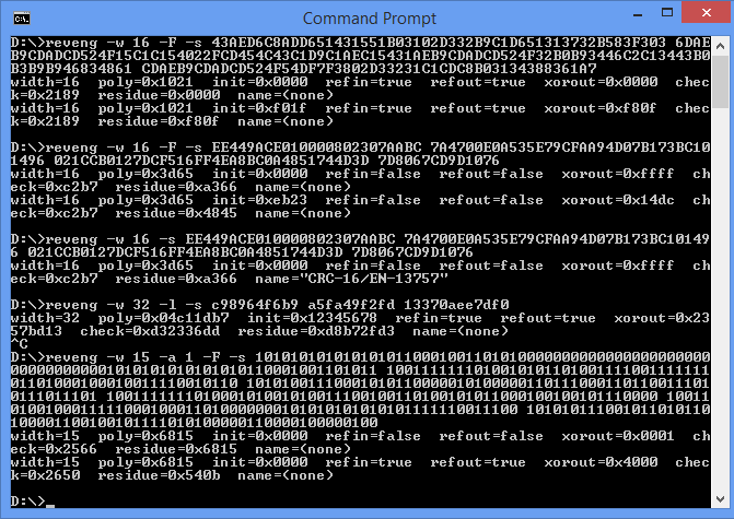 CRC RevEng is a portable, arbitrary-precision CRC calculator and algorithm finder. It calculates CRCs using any of the 113 preset algorithms, or a user-specified algorithm to any width. It calculates reversed CRCs to give the bit pattern that produces a desired forward CRC. CRC RevEng also reverse-engineers any CRC algorithm from sufficient correctly formatted message-CRC pairs and optional known parameters. It comprises powerful input interpretation options. Compliant with Ross Williams' Rocksoft(tm) model of parametrised CRC algorithms.