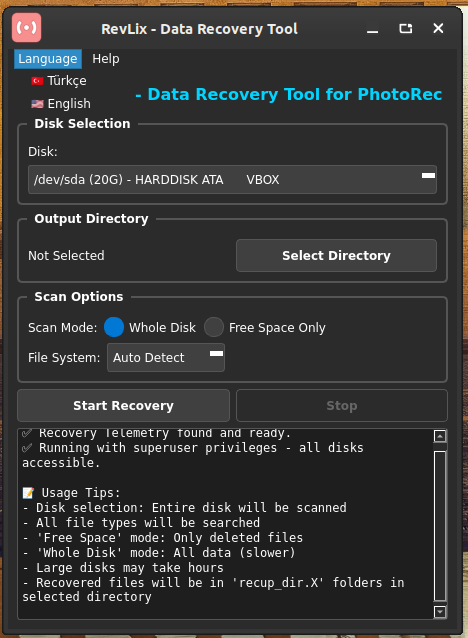 RevLix is a powerful data recovery tool developed to recover deleted files on Linux systems. This program uses the PhotoRec infrastructure and provides a graphical user interface (GUI) for PhotoRec.