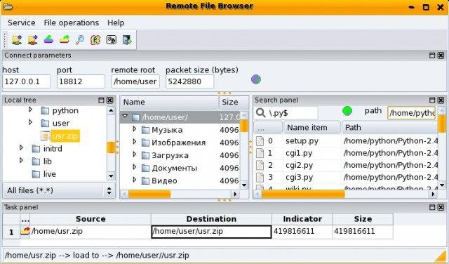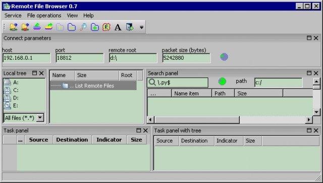 Remote File Browser written into Python with wxPython and Rpyc. Support download, upload, remove and search files/folders. Also support crossplatform communications.