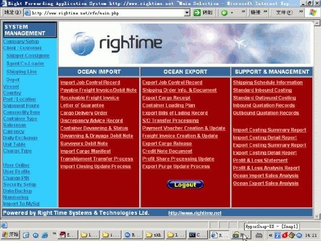 Right Forwarding System is the first open source forwarding system in the world.It uses popular web-development technology, and the technology and integrate of Compiere/Jasper/Ireport/SugarCrm/VtigerCRM. 第一套开放原代码物流货代船代系统