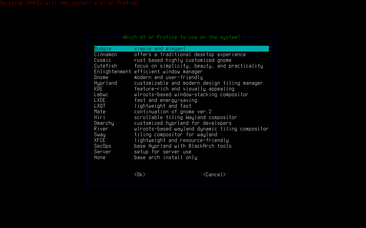 - GUI Environments: Budgie/Cinnamon/Cosmic/Cutefish/Enlightenment/Gnome/Hyprland/KDE/LXDE/LXQT/Mate/Niri/River/Sway/XFCE