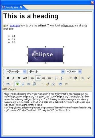 richhtml4eclipse is a WYSIWYG HTML-editor widget for SWT and can be integrated into an Eclipse environment. THIS PROJECT IS NOT UNDER ACTIVE DEVELOPMENT: see https://bugs.eclipse.org/bugs/show_bug.cgi?id=319018 for the continued project.