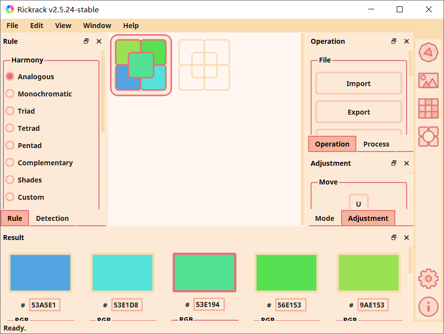 Rickrack is a free and user-friendly color editor. It is designed to generate a set of harmonious colors from the color wheel or other places. You can share these colors with your friends, or apply them into your creative works. What’s more, you can export them into individual files and import them into other softwares such as Adobe Photoshop, GIMP, Krita, Pencil 2D and Clip Studio Paint.