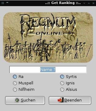 get_ranking_gtk is a gui-based webpage-searching program. It searches the online-ranking of the MMOG Regnum Online for all statistics about a given player and shows them to the user. It requires additional Ruby, GTK and Ruby-Gnome2.